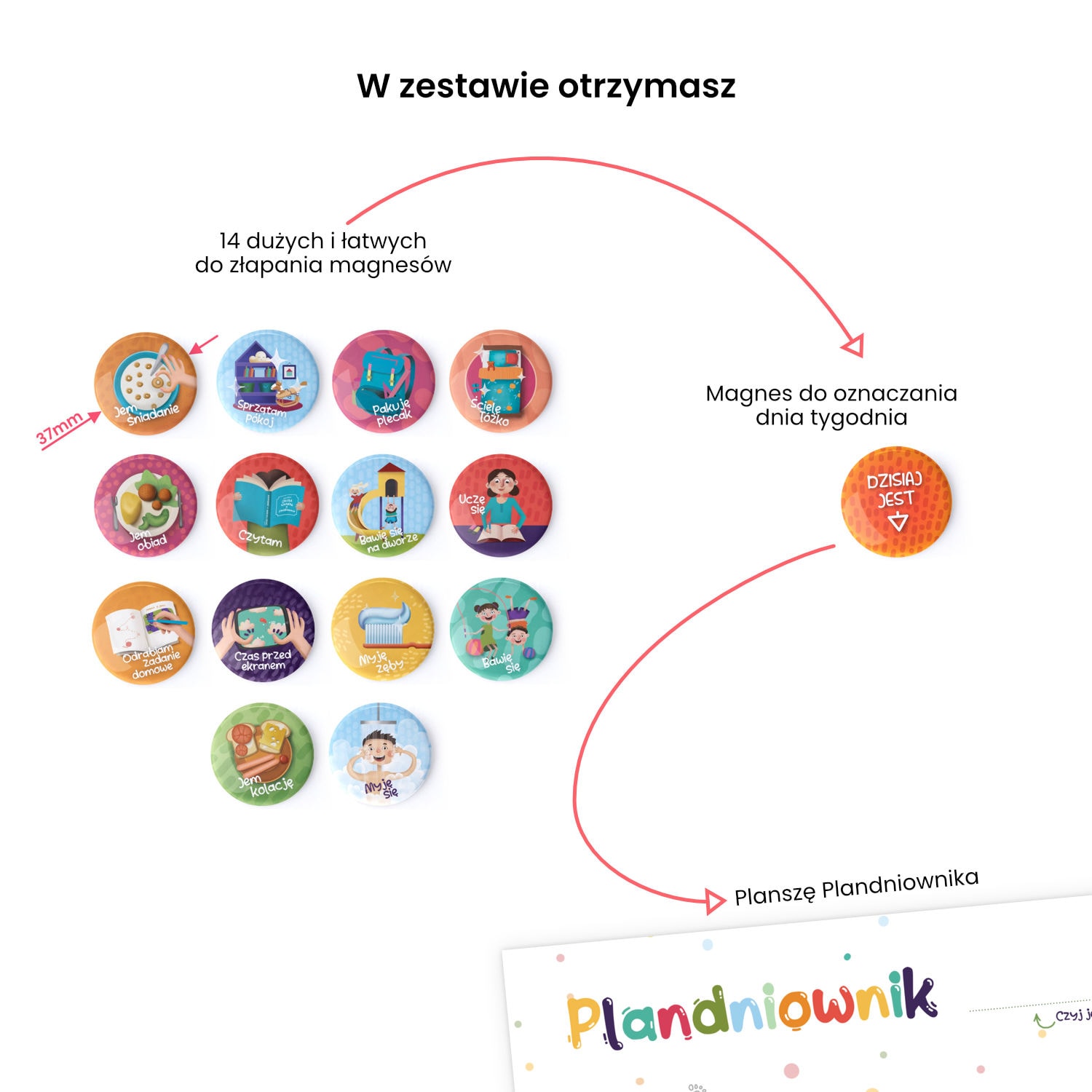 • W zestawie otrzymasz Plandniownik, 14 magnesów z zadaniami dla ucznia oraz magnes do oznaczania dnia tygodnia.