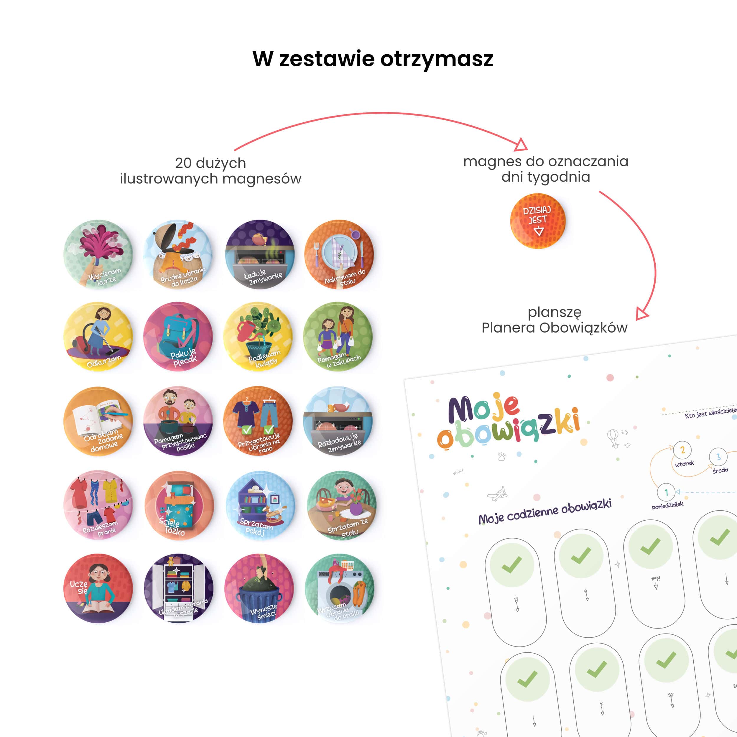 W kategorii Magnesy do Planowania dla dzieci możesz dokupić dodatkowe magnesy, które świetnie pasują też do Planera Obowiązków. Dostępne są też puste magnesy, na których możecie napisać lub narysować własne zadania.