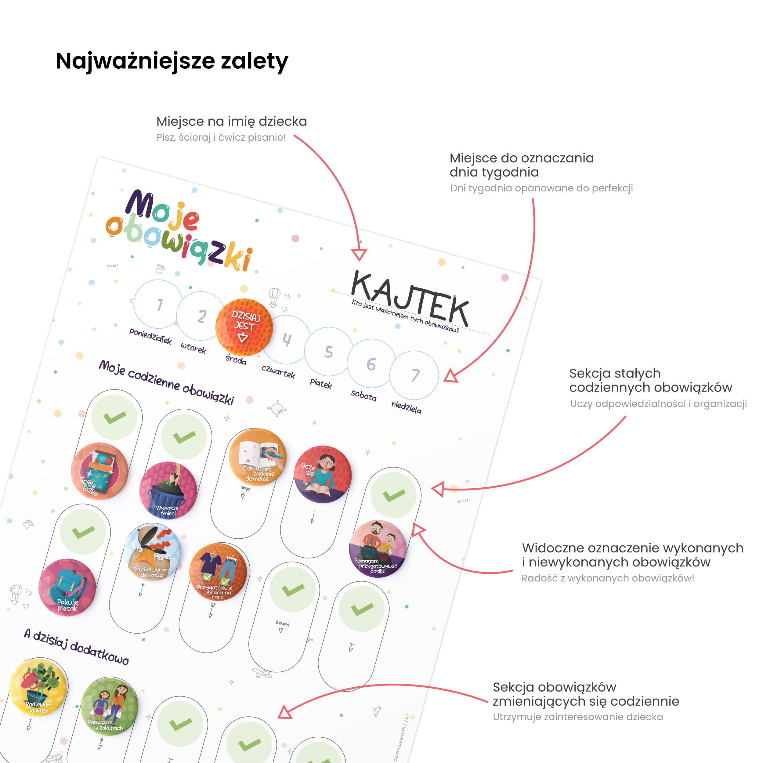My od dawna nie idziemy w wychowaniu naszych dzieci w stronę punktów czy uśmiechniętych lub smutnych buziek. U nas sprawdza się stwierdzenie, że najlepszą nagrodą za wykonanie zadania powinna być dla dziecka jego wewnętrzna satysfakcja. Planer obowiązków w atrakcyjny sposób pokazuje, które obowiązki są wykonane. Dzięki temu dziecko odczuwa satysfakcję z samodzielnie wykonanych obowiązków. To z kolei pomaga budować poczucie własnej wartości.