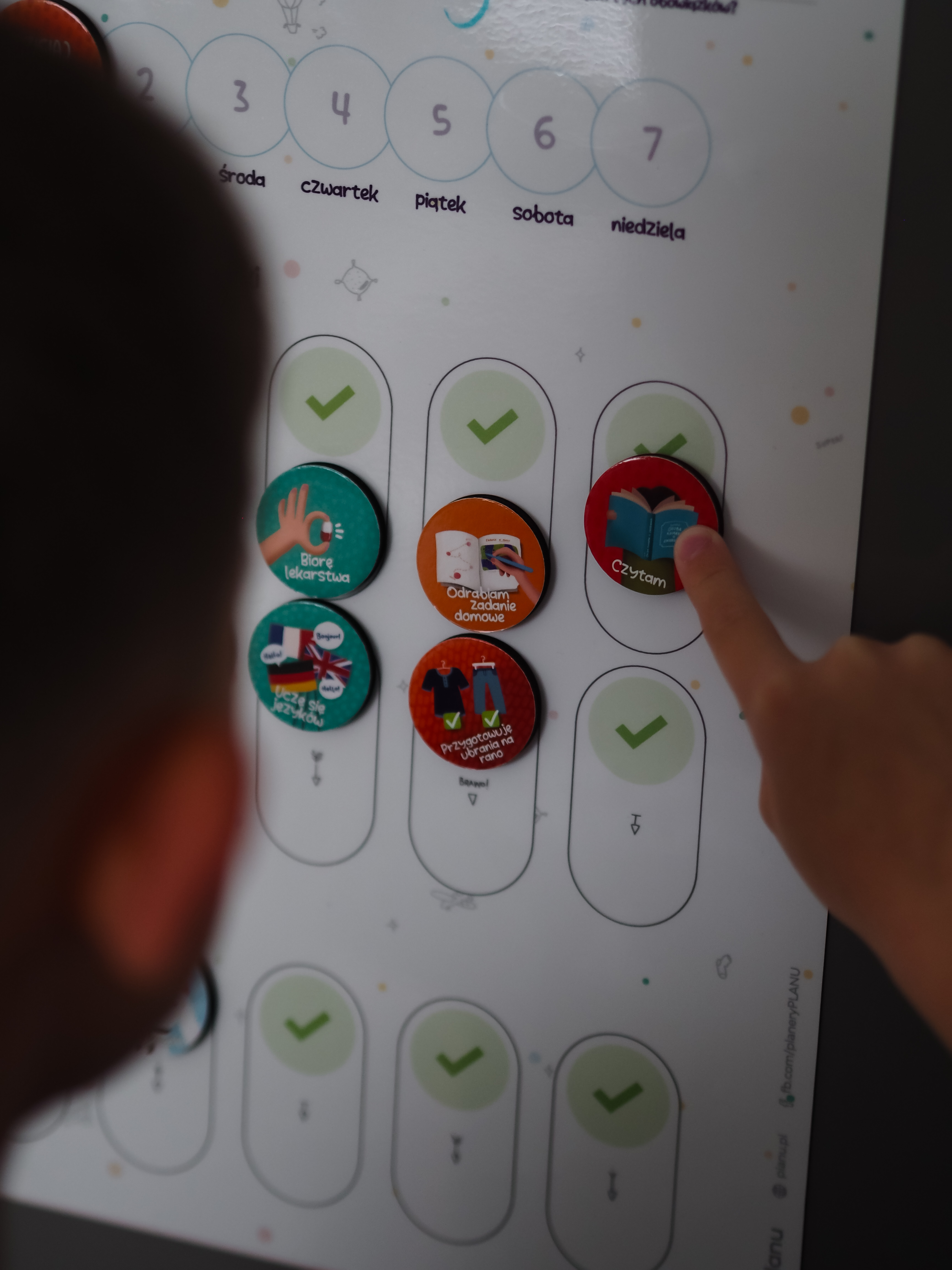 - Zaplanujcie wspólnie codzienne obowiązki układając magnesy w pierwszej częśći planera – nie układaj wszystkich na raz! Za dużo obowiązków na raz może przerosnąć lun przytłoczyć Twoją pociechę. Ponadto dokładanie kolejnych magnesów co jakiś czas pomoże utrzymać zainteresowanie Planerem Obowiązków.